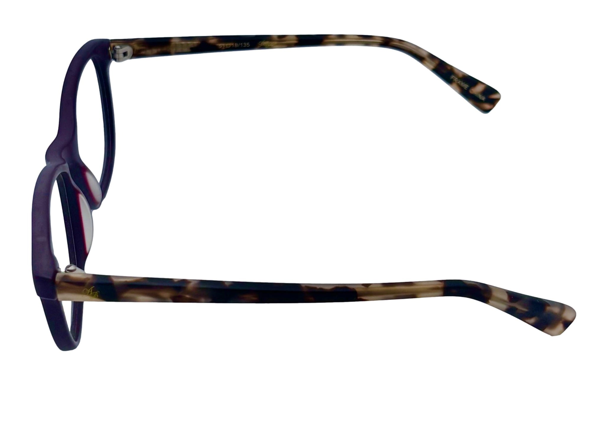 This is brand new Apple Bottoms Eyeglass Frame. , It has stainless steel metal hinge on each temple, Normal retail was about $275.00. Multi Eggplant Plastic Triple Laminate Plastic Frame This Comes with a Apple Bottoms case Size: 51 18 135, Height 40mm Spring Temples Molded Plastic Nose Pads Stainless Steel temples Full Plastic frame Inside is Light Brown You Pay: $39.99 Clear Demo Lens Apple Bottoms tag on inside of temple tips Last One You can take this to your doctor and have you prescription put in and save a ton on money