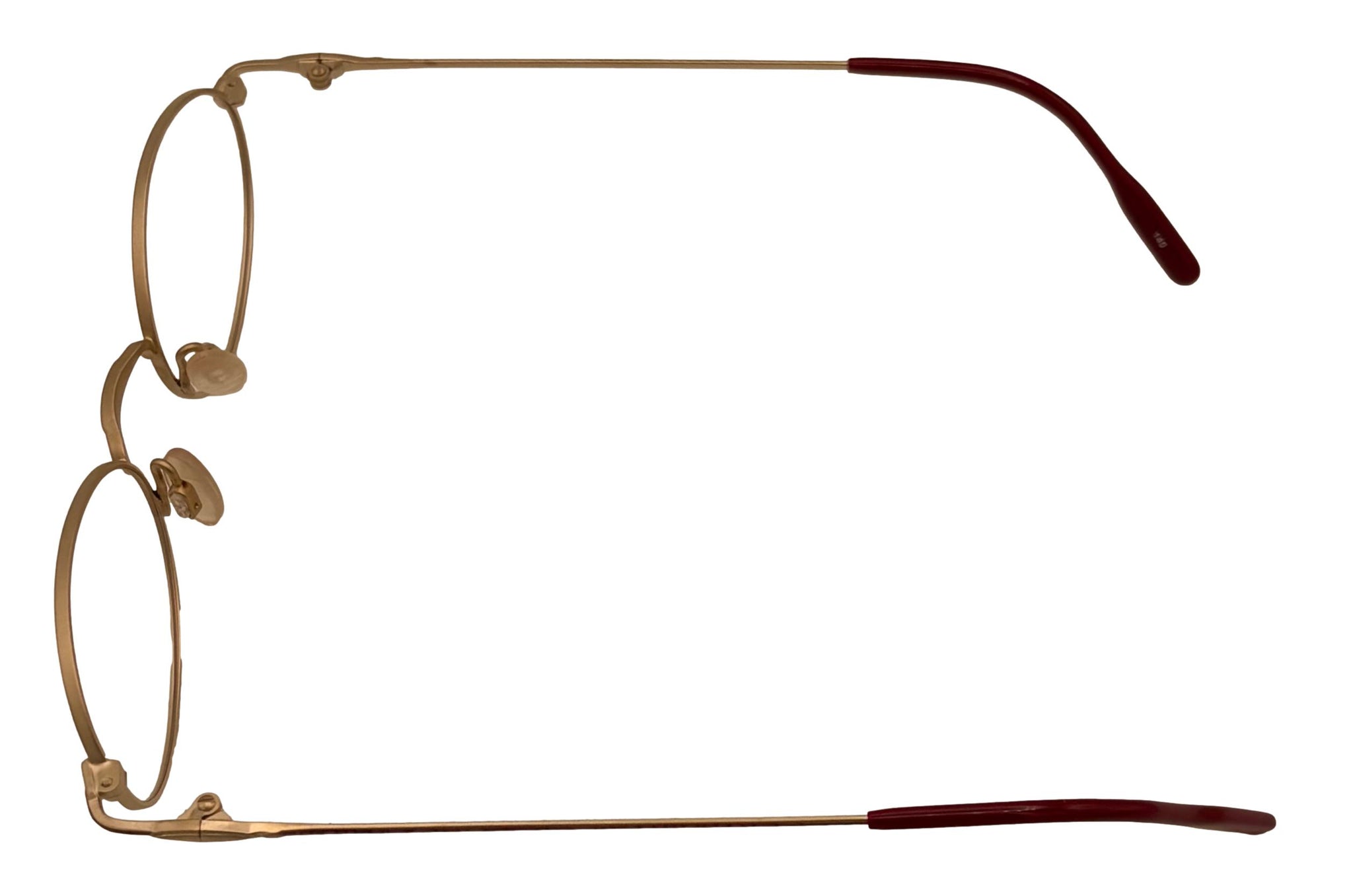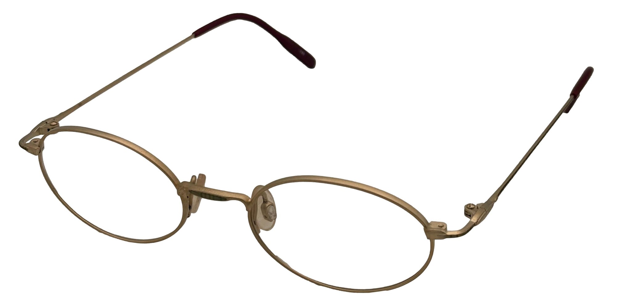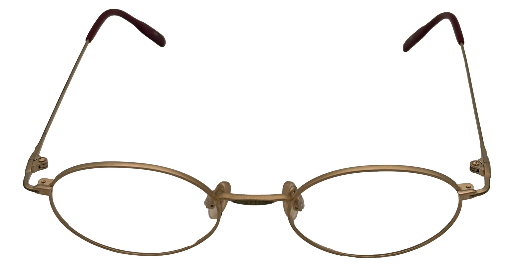 This brand new Bob Mackie BM 776 oval eyewear features a stylish matte gold mist metal frame, measuring 47mm. It is designed with thin metal temples and includes hand-made zyl temple tips for comfort. The front of the frame is a violet soft oval, and it comes with plain black eyewear. Made in Japan, this frame has a bridge width of 19mm, a temple length of 140mm, and a height of 30mm. You can easily take this durable frame to your eye care professional to have your personal lenses installed.
