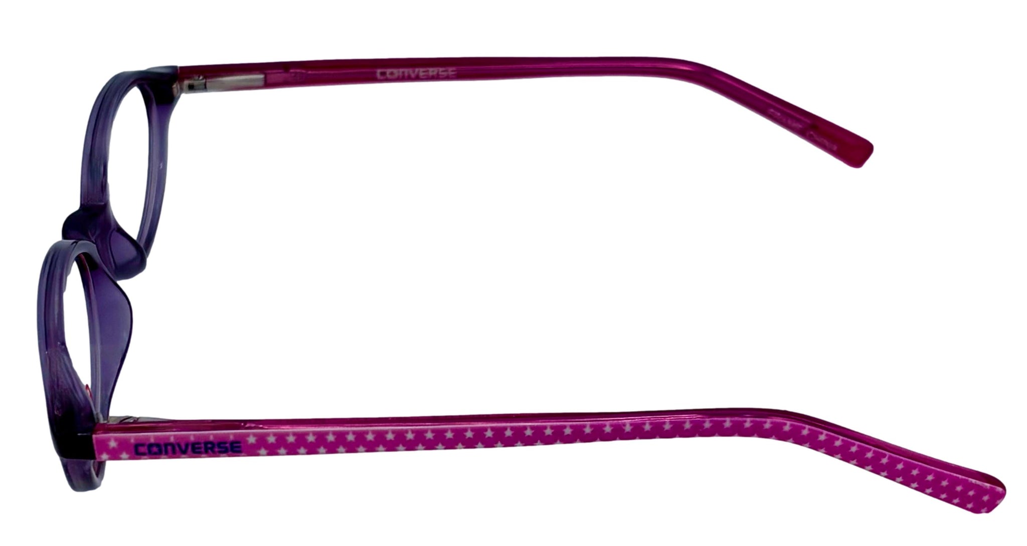 This is brand new Converse Eyeglass Frame. , It has plastic temples, Normal retail was about $275.00. Purple Plastic Temples. This product now come with Genuine Converse Case Solid Purple Front Size: 46 16 125, Height 29mm, Purple Plastic Frame, Regular Retail: $275.00 You Pay: $39.99 Light Frame Lens is a soft rectangle full frame Converse All Stars feature hand-made zyl temple tips on most models. As with zyl products, heat must be applied to the zyl prior to adjusting to help prevent cracking You can take this to your doctor and have you prescription put in and save a ton on money You Pay Only $39.99 now