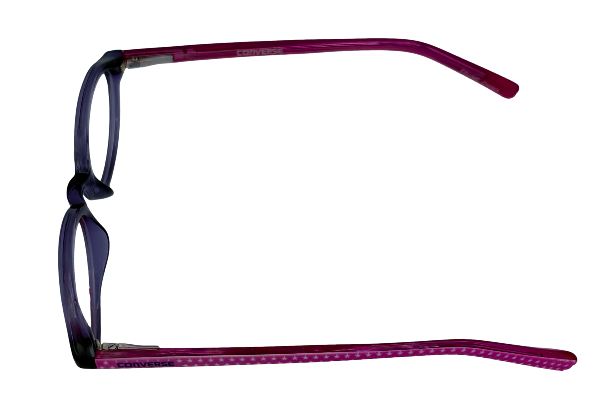 This is brand new Converse Eyeglass Frame. , It has plastic temples, Normal retail was about $275.00. Purple Plastic Temples. This product now come with Genuine Converse Case Solid Purple Front Size: 49 16 130, Height 32mm, Purple Plastic Frame, Regular Retail: $275.00 You Pay: $39.99 Light Frame Lens is a soft rectangle full frame Converse All Stars feature hand-made zyl temple tips on most models. As with zyl products, heat must be applied to the zyl prior to adjusting to help prevent cracking You can take this to your doctor and have you prescription put in and save a ton on money You Pay Only $39.99 now